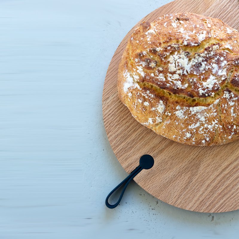 Das Holzbrett besticht durch die eingesetzte blaue Silikonschleife und passt zu anderen Produke von DesignBite