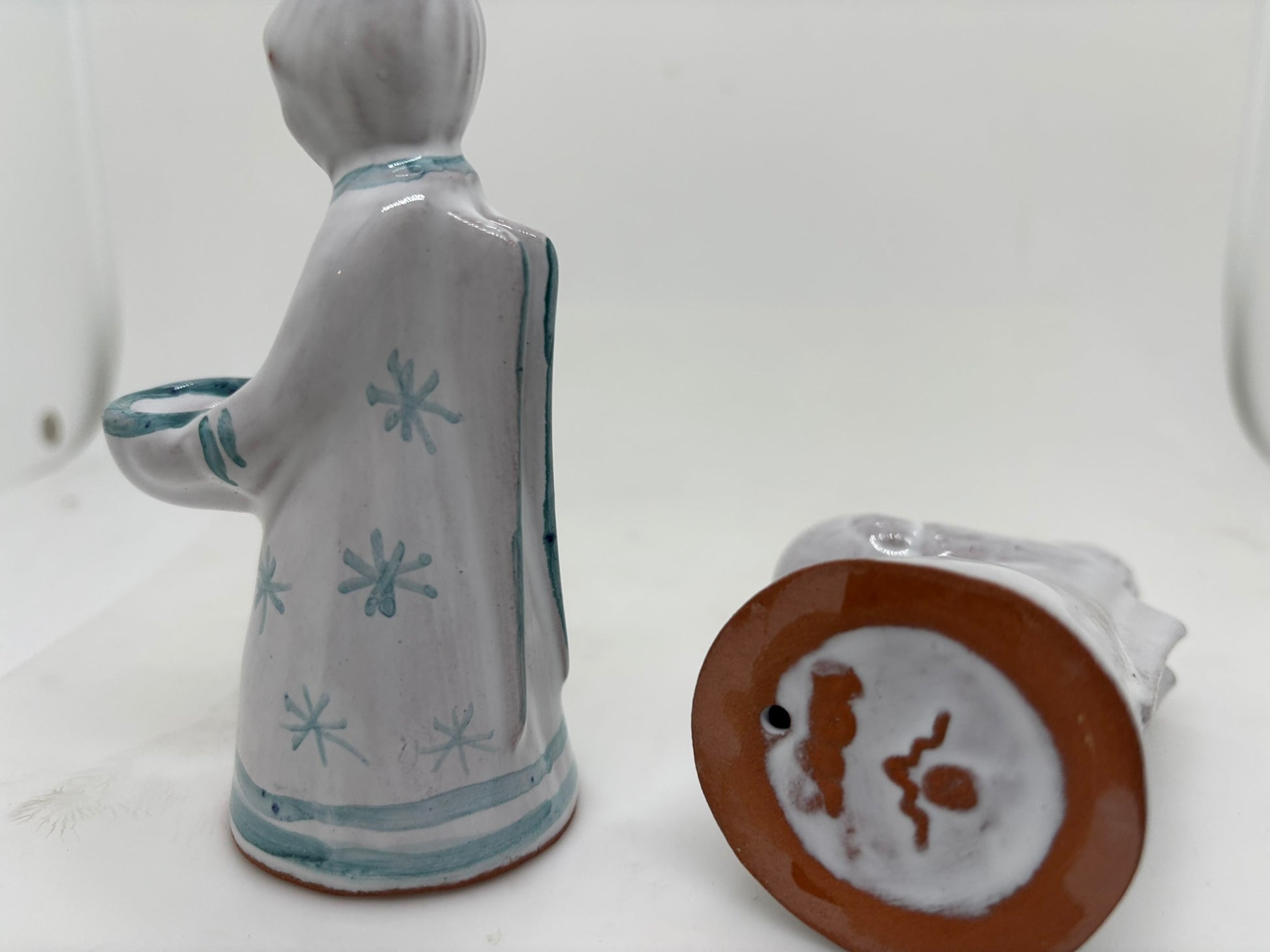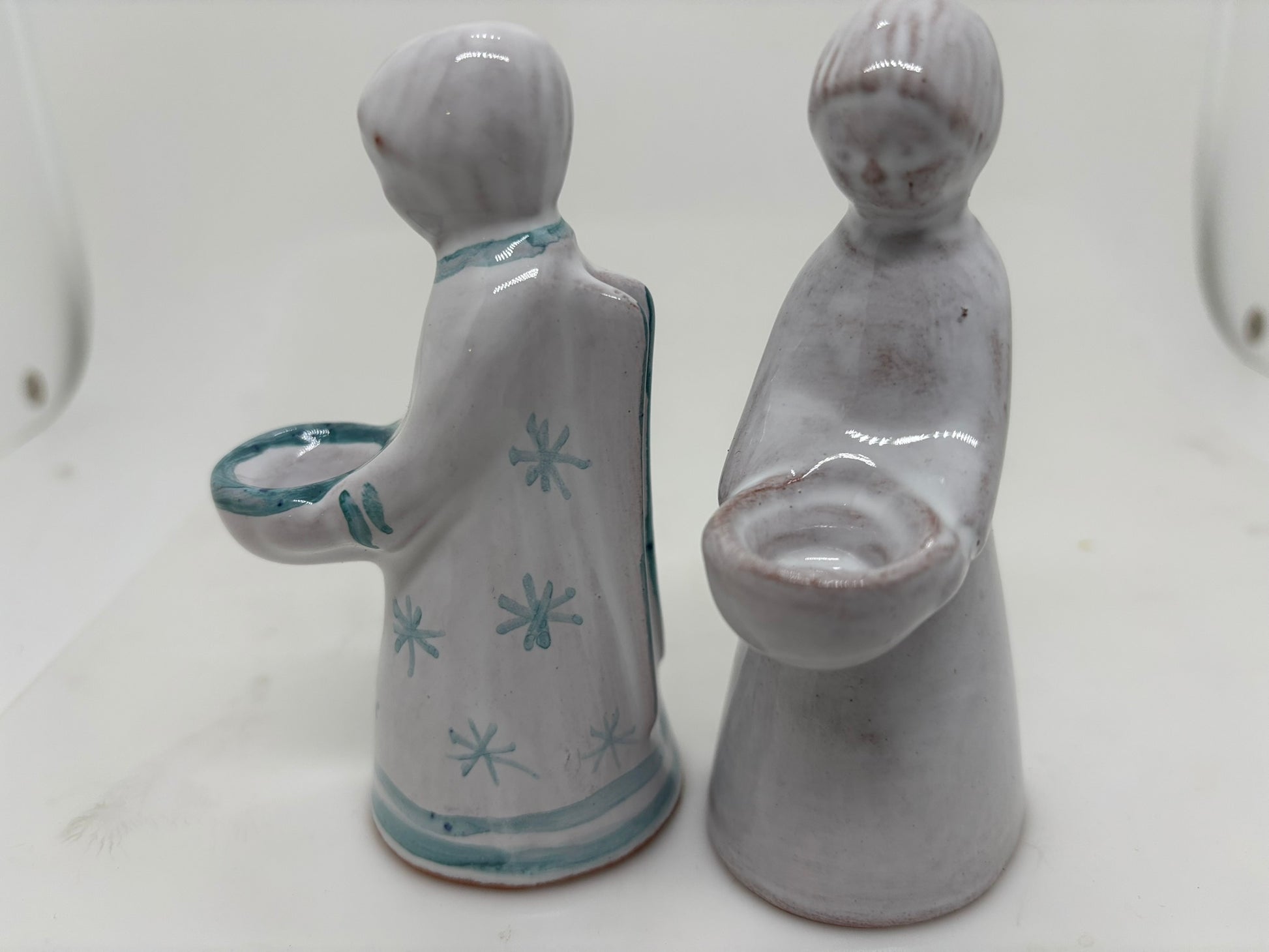 zwei Keramikengel von der ehemaligen Karlsruher Majolika. In den angedeutenden Kerzenhalter passt eine Weihnachtsbaumkerze. Weiße Keramiklasur, einmal uni und einmal bemalt. 9 cm hoch, mit Bodenmarke der Manufaktur, Entwurf von Fridegard Glatzle.